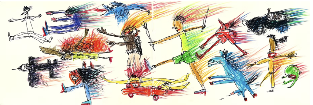 Ces bourgeonnements perpétuels abondent comme le chiendent. Ils distinguent ces dessins et semblent incontrôlables car ils figurent l’énergie vitale en mouvement, chez les humains, les machines, les animaux. Privés de la focalisation et la stabilité — que l’art classique prône comme valeur depuis des siècles — ces organismes se succèdent dans le désordre et rien ne semble pouvoir freiner ces flux aussi inarrêtables que la lave qui s’écoule d’un volcan. Souvent on voit la page de gauche qui déborde sur la page de droite, et pourrait ainsi s’étendre jusqu’à devenir l’équivalent de la tapisserie de Bayeux, ou d’un film expérimental de Norman McLaren dans les années 1950. Cette exubérance amplifie l’espace, génère des bras et des jambes écartés qui prolifèrent comme des stolons, des corps en mouvement qui envahissent tout l’espace disponible de l’image.