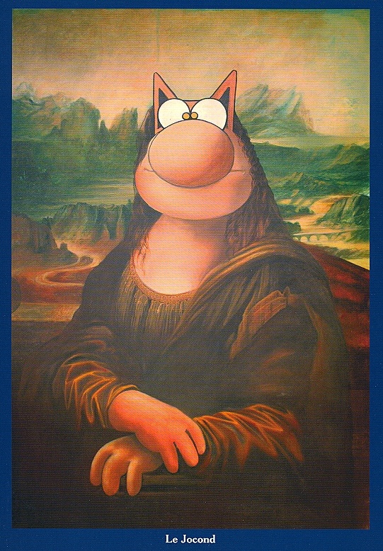Mais s’agit-il bien d’une exposition de bande dessinée? Philippe Geluck est-il un créateur de BD? Au sein de la profession, certains semblent ne pas le considérer comme tel. Assurément il ne peut être réduit à cette définition. L’homme a toujours brouillé les pistes en allant partout où son désir le conduisait: comédien de théâtre pendant une dizaine d’années, animateur de radio, chroniqueur à la télévision (chez Michel Drucker jusqu’en 2008), sociétaire des Grosses Têtes à partir de 2014, dessinateur, écrivain, peintre et sculpteur. On se souvient de son exposition à l’École nationale des beaux-arts de Paris en 2003, de celle accueillie par le musée Soulages de Rodez en 2020-21 (https://musee-soulages-rodez.fr/expositions/expositions-passees/le-chat-visite-le-musee-soulages/) et de l’opération Le Chat déambule sur les Champs-Élysées en 2021, qui présentait vingt sculptures monumentales en bronze du Chat (elles ont, depuis, visité une dizaine d’autres villes). J’avais moi-même installé en majesté sa toile Le Jocond à l’entrée de mon exposition sur la parodie, à Angoulême, en 2011, où elle était évidemment parfaitement à sa place.