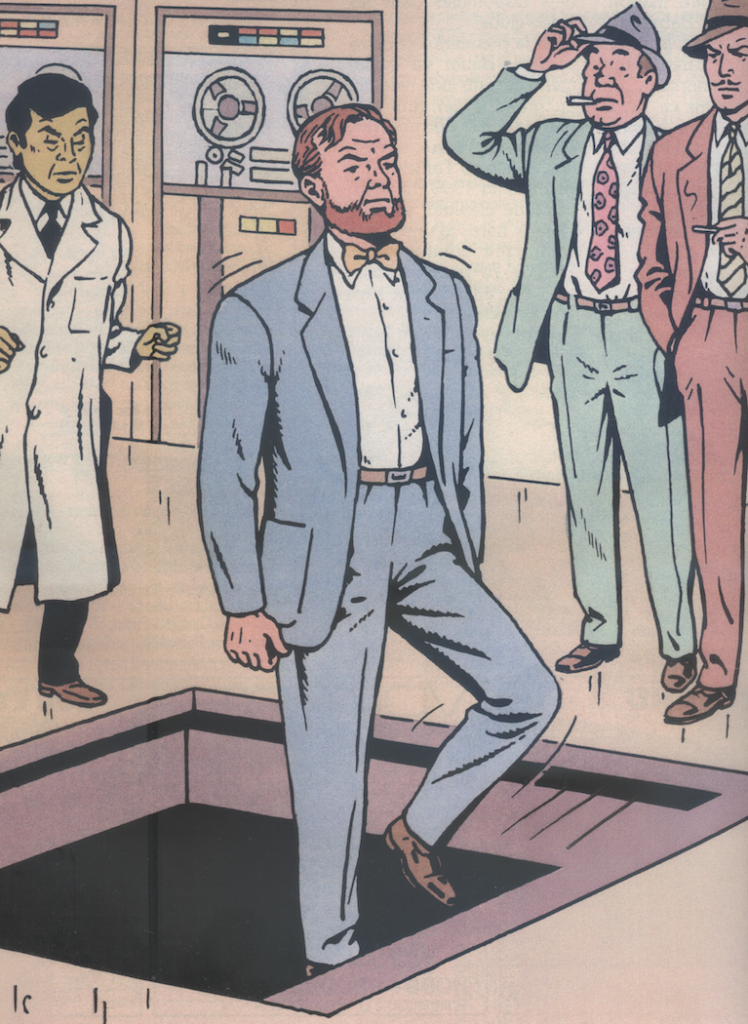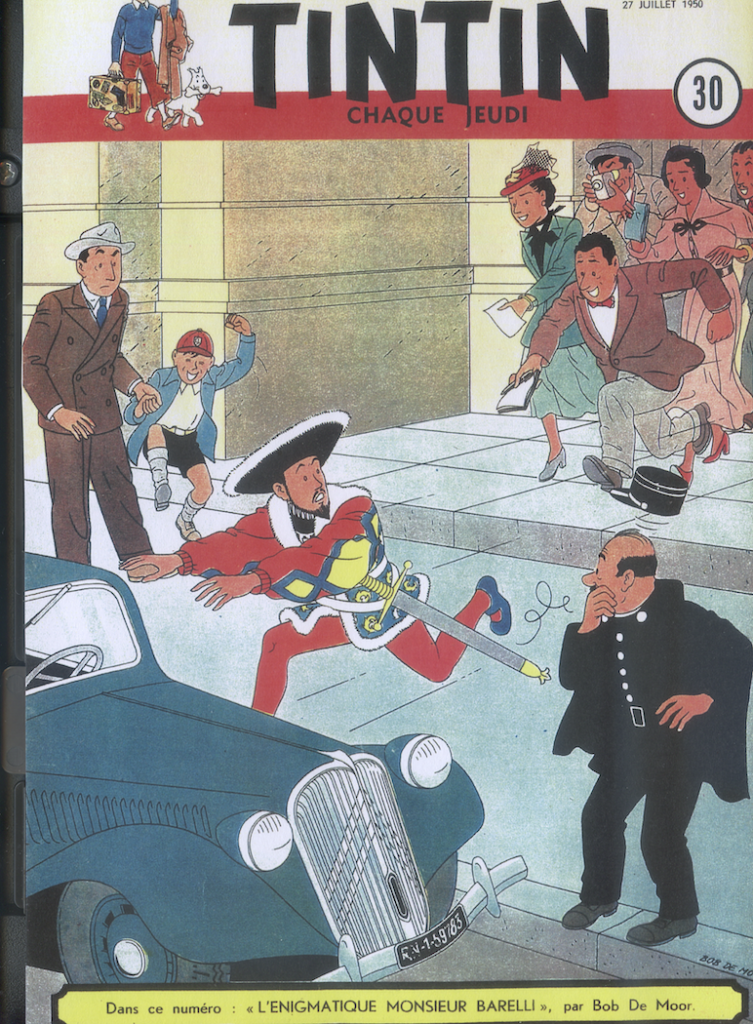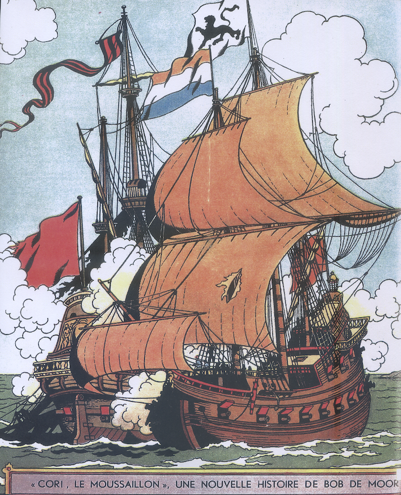 Plus tard, il aidera son ami Willy Vandersteen, Anversois comme lui. Il travaillera sur certains décors du Fantôme espagnol et sur La Révolte des Gueux. Le merveilleux Monsieur Tric débarque en 1950 dans le Journal Tintin, suivi de Barelli, autre grand héros. Un an plus tard, Bob De Moor est engagé aux studios Hergé, il n’a que 26 ans. Il compose le célèbre dessin de la fusée sur son pas de tir: trois semaines de travail ininterrompu, une merveille. L’année suivante, Bob De Moor crée un nouveau héros promis à une belle vie, Cori, encore un moussaillon, héros de la Compagnie des Grandes Indes, au 16e siècle.