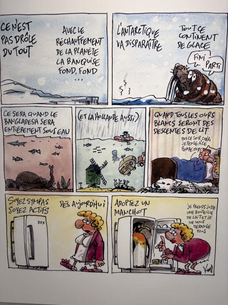 Il faut rappeler ici que Pierre Kroll, né en Afrique et titulaire d’une licence en sciences de l’environnement, sait mieux que quiconque que notre petite planète bleue devient invivable, avec des épisodes de sécheresses et d’incendies d’un côté, des inondations en série de l’autre. Dans certaines parties du monde — et peut-être bientôt chez nous — la guerre de l’eau s’apprête à faire davantage de victimes que les conflits déclenchés par les dictatures toujours plus nombreuses et plus sanguinaires. L’eau, que l’on croyait inépuisable à l’image des ressources naturelles, rappelle que le saccage de notre unique Terre au nom du profit conduit l’espèce humaine au suicide aussi sûrement qu’elle a déjà exterminé la plupart du monde sauvage.