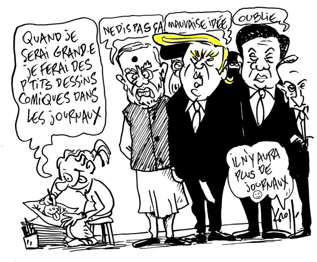 Aujourd’hui, avec les réseaux, le métier consiste à envoyer ses productions dessinées à on ne sait trop qui, qui les lira on ne sait trop où, et on ne sait trop quand. Ainsi, il est possible que le dessin innocent d’hier devienne un crime demain. Qui sait? Les menaces de mort ne sont plus une fiction: elles rendent le métier plus difficile, voire périlleux, et le gilet pare-balles devient un des accessoires du dessinateur de presse, au même titre qu’un porte-mine.