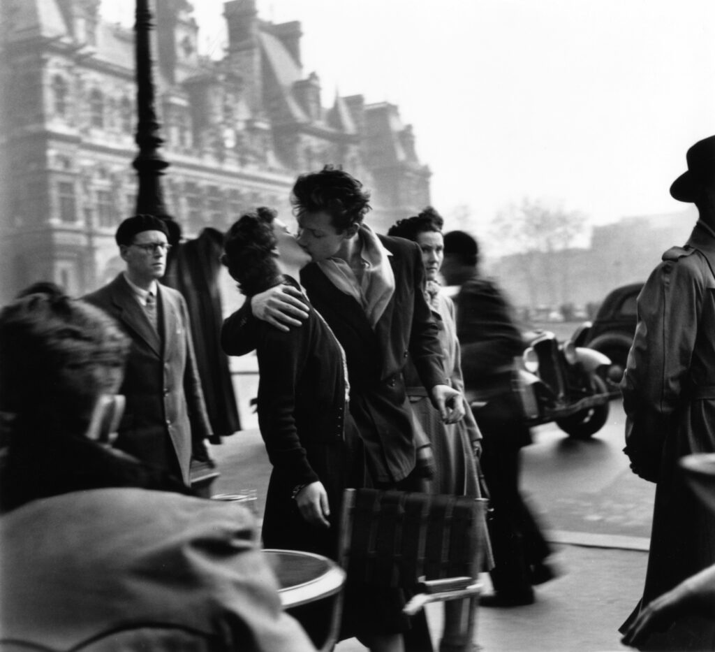 Après le musée Maillol à Paris, c’est à Liège que l’exposition Robert Doisneau s’installe. Le baiser de l’Hôtel de Ville, à Paris, en 1950, est une commande du magazine américain Life à propos des amoureux de Paris. Devenue en peu de temps une image parmi les plus connues au monde — des dizaines de milliers d’exemplaires du magazine ont été vendus, et le poster a été punaisé dans d’innombrables chambres d’étudiants — elle incarne le triomphe de la vie après les années noires de la guerre. Les jeunes gens, seuls au monde, s’aiment au vu et au su de tous. Ce n’est pas un hasard si, peu après, Georges Brassens fait un tabac avec Les Amoureux des bancs publics, lorsqu’en 1953 il chante: ‘C’est sur un de ces fameux bancs qu’ils ont vécu le meilleur morceau de leur amour’.