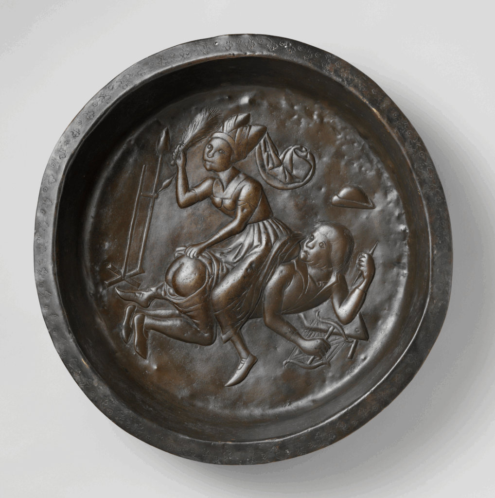 Plat représentant une Femme battant son mari, alliage de cuivre, Dinant – Belgique, 1480 © Irwin Untermyer / Met – New York
