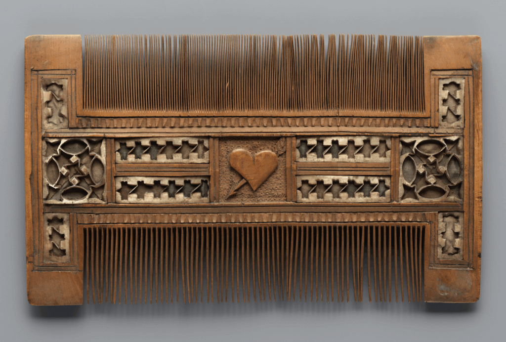 Peigne, Buis incrusté d’os et orné de soie rouge et verte, France, 15e -16e siècle © Met – New York