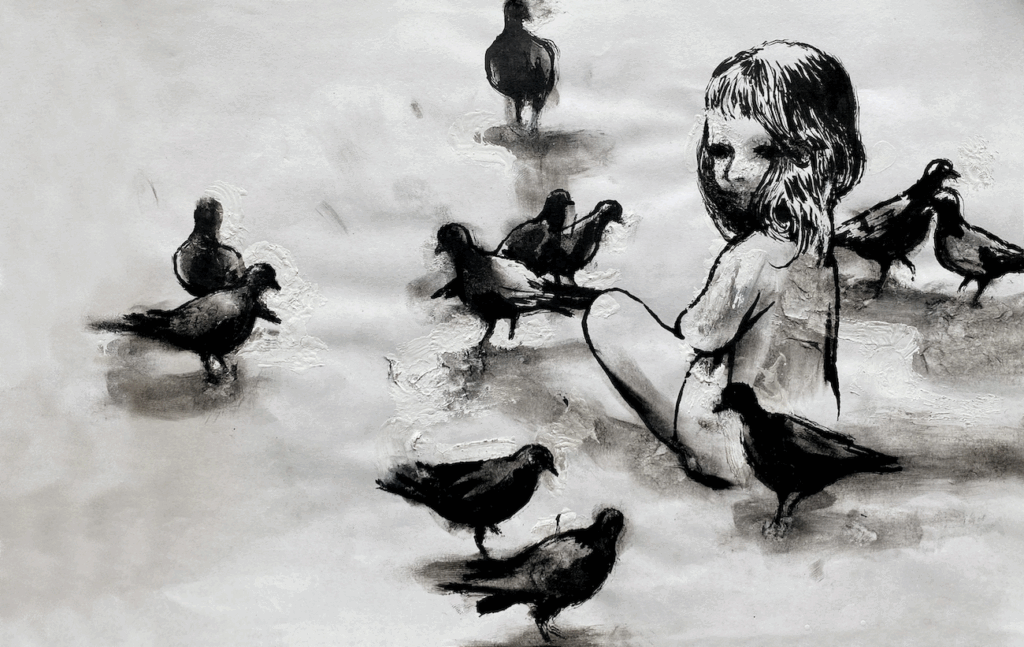 étend sur le papier par touches d’un blanc éblouissant, pour évoquer le grain
