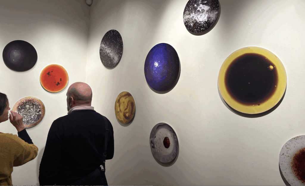 Les surfaces circulaires de ces tondos sont des photographies, des images bien réelles… qui à première vue ne représentent pas grand-chose, et donc laissent le champ libre à l’imagination. Mais l’imagination ne peut inventer qu’à partir de ce qu’elle connaît, elle aussi. Et donc on a pu écrire à partir de l’un de ces tondos que ‘la vérité ne sort plus du puits mais bien de l’assiette dans laquelle un fond d’huile d’olive maculé de vinaigre balsamique devient une éclipse solaire!’. De cet autre tondo on pourrait affirmer y voir le grouillement d’une culture de micro-organismes en laboratoire. Ainsi, l’infiniment grand et l’infiniment petit qui excluent le temps et l’espace de l’humanité se rejoignent dans ces images capturées dans un des lieux les plus humains qui soit: une assiette dans une cuisine.